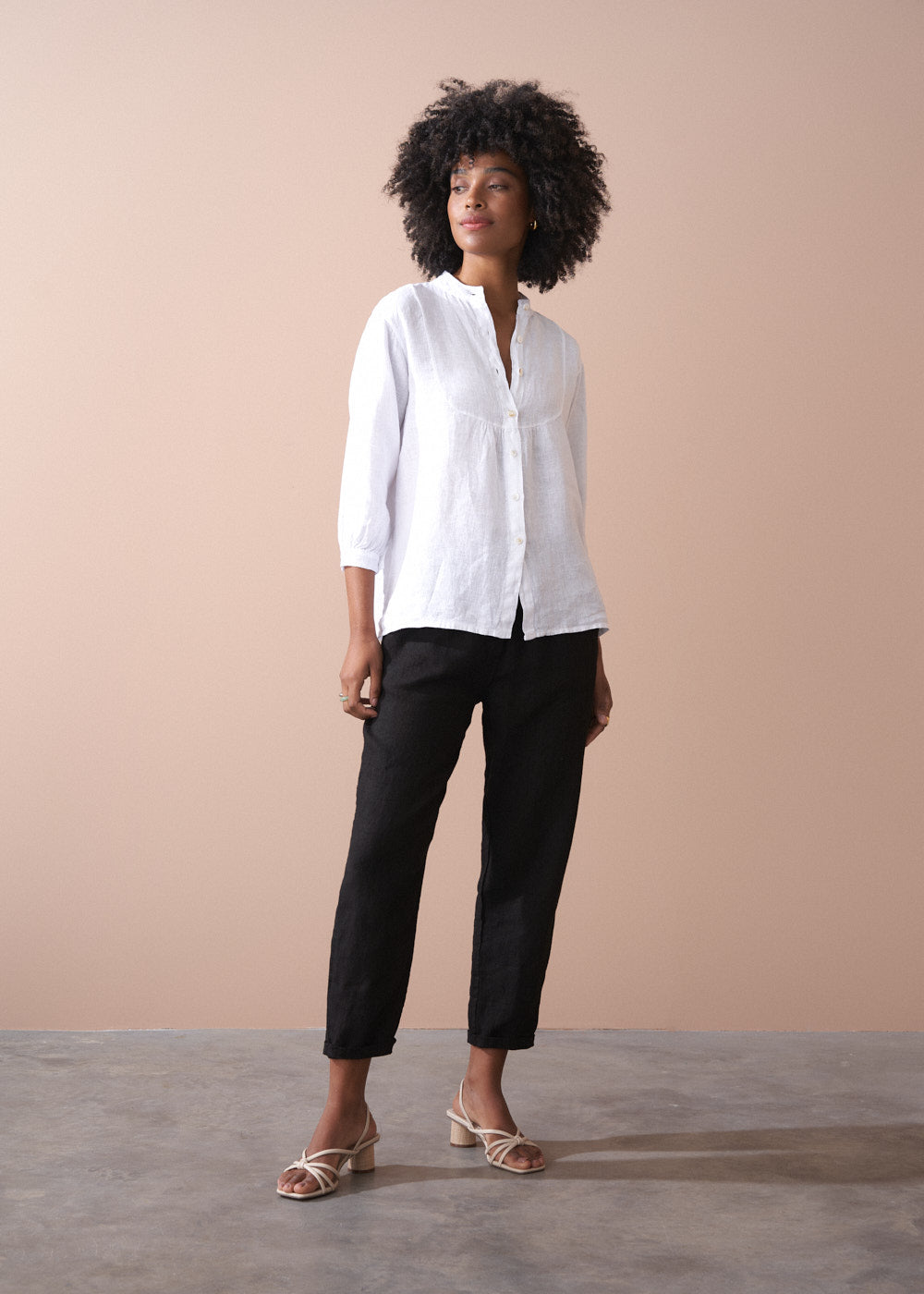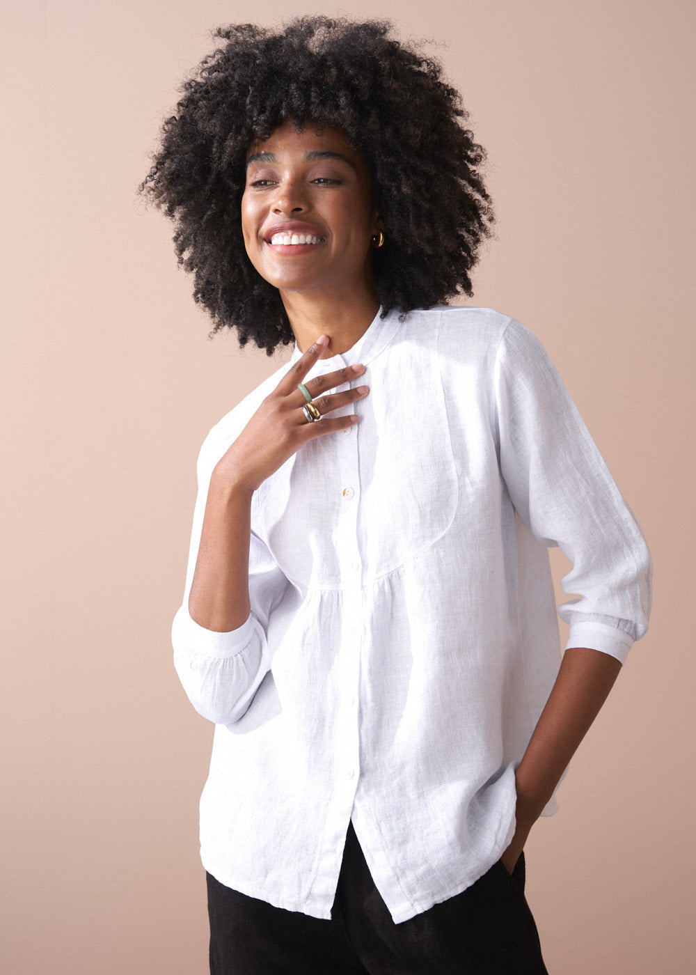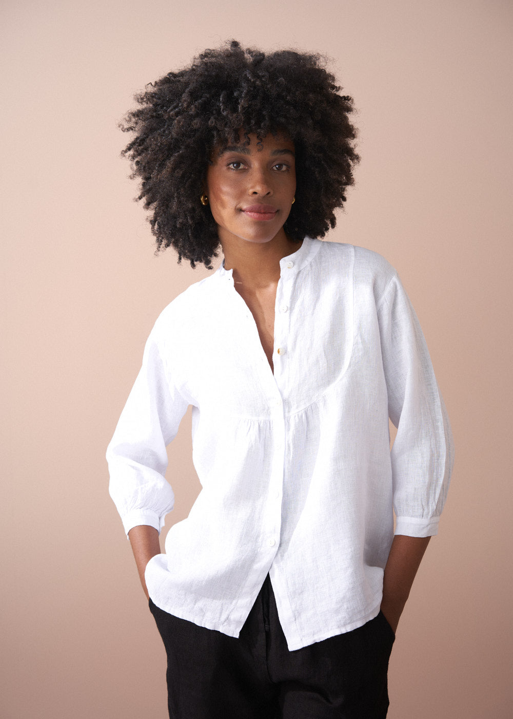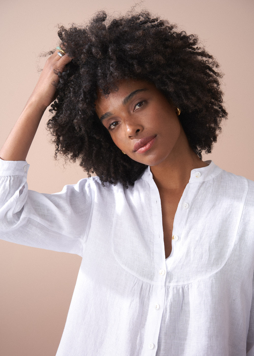 A returning favourite, the Bib shirt combines a chic blouse with the versatility of a classic button-down to create a breathable, easy-to-wear wardrobe essential. Style it unbuttoned as a lightweight jacket for layering on cool evenings.