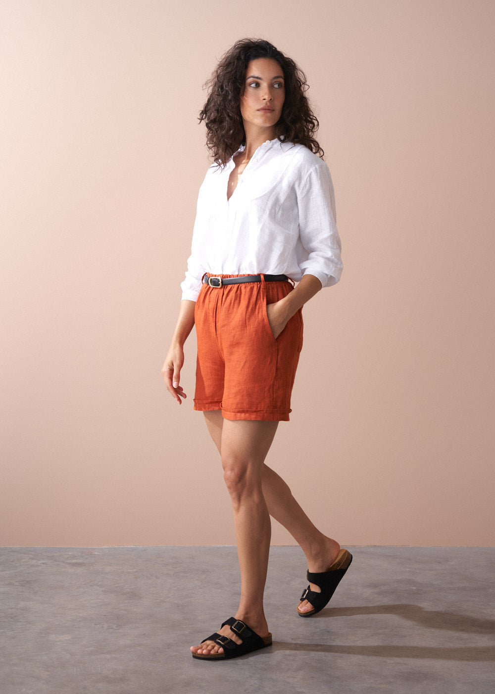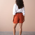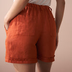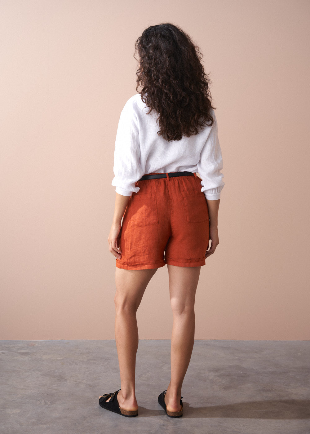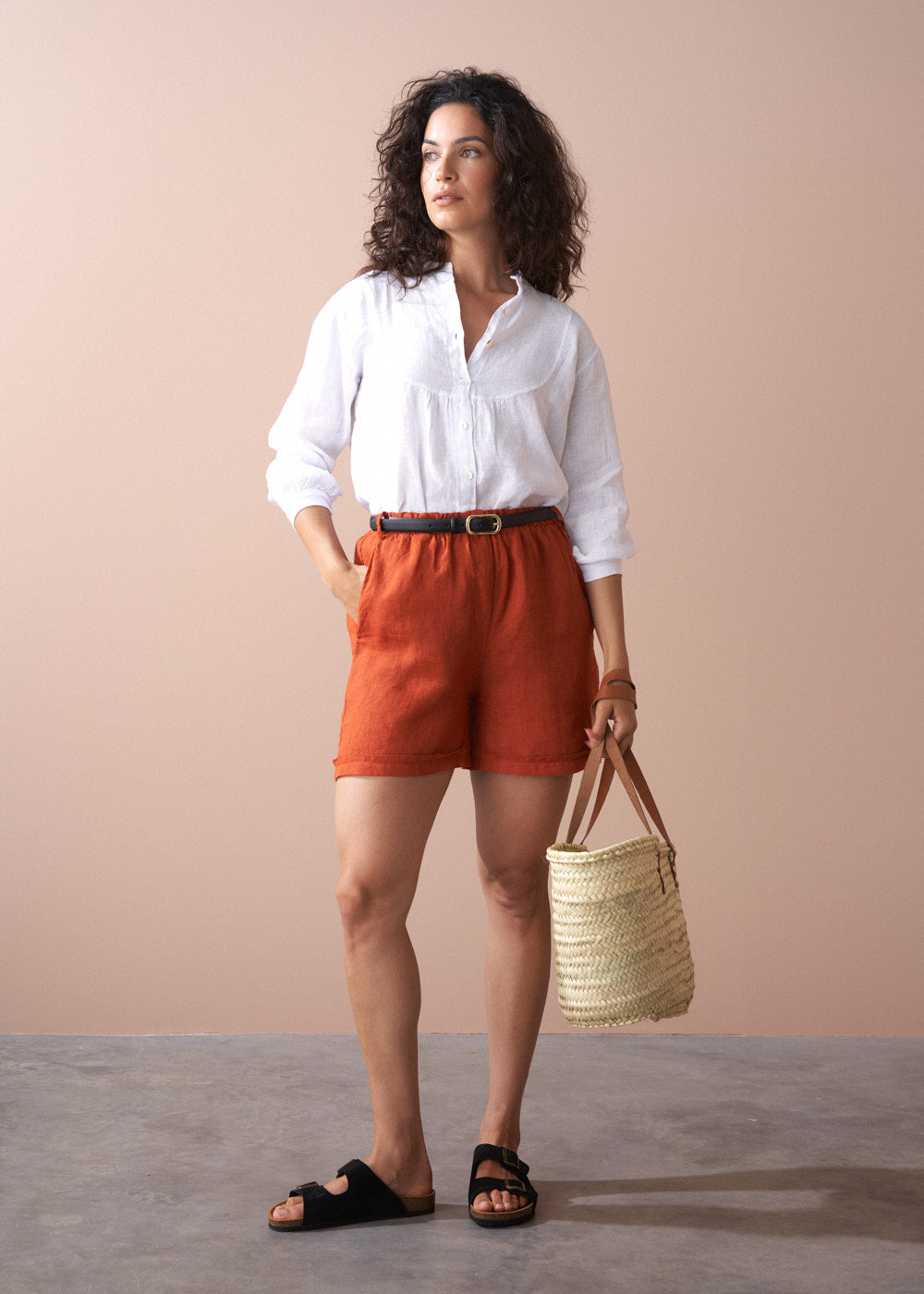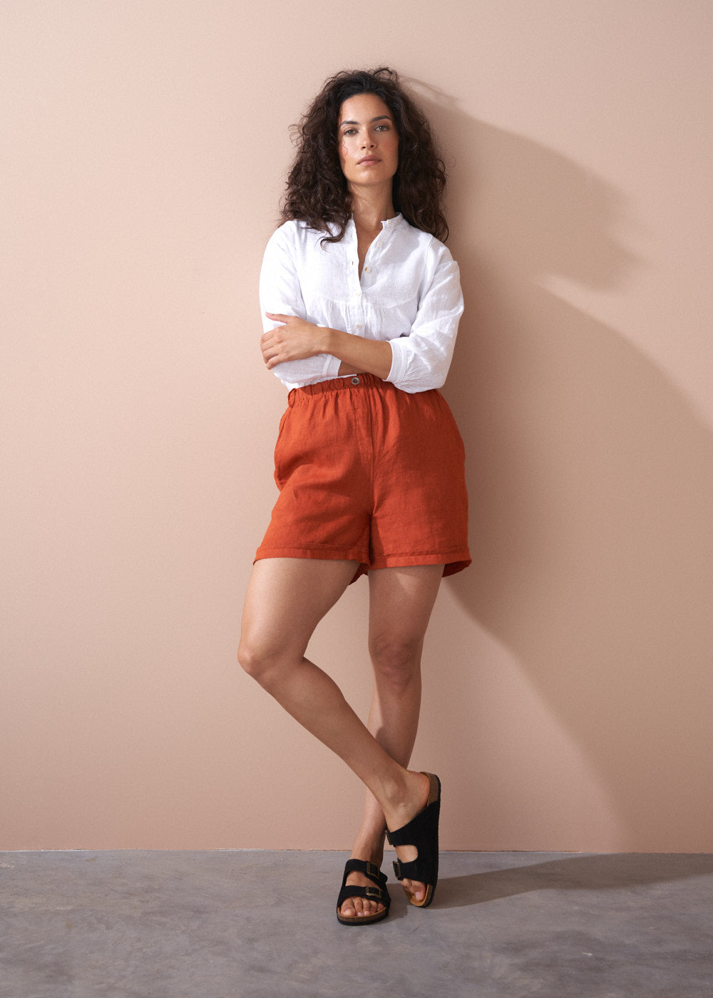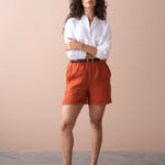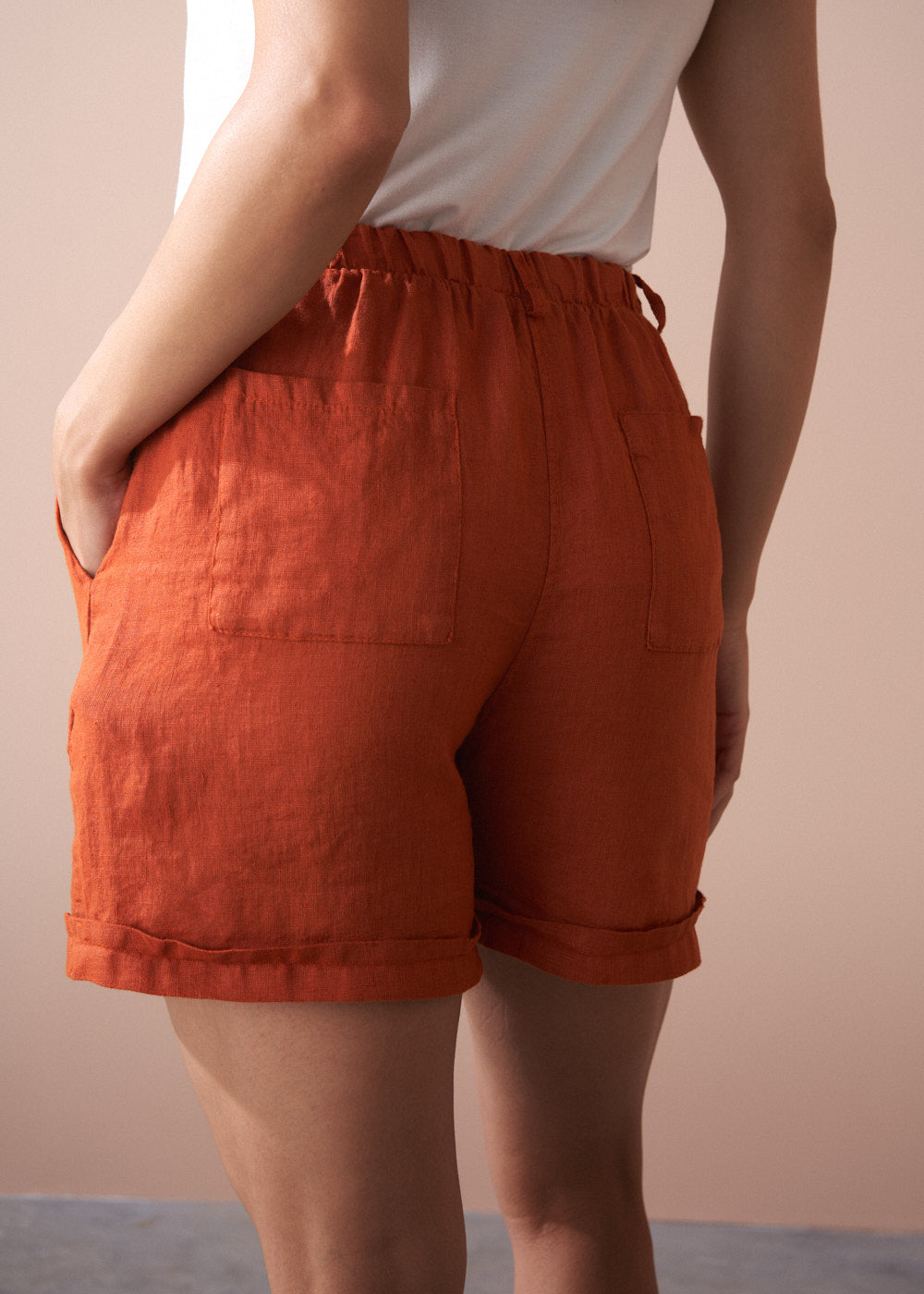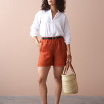 Crafted from breathable linen in a rich terracotta red, the Linen Shorts are a striking warm-weather essential. The elasticated waistband ensures all-day comfort while the A-line silhouette offers a refined, tailored feel.