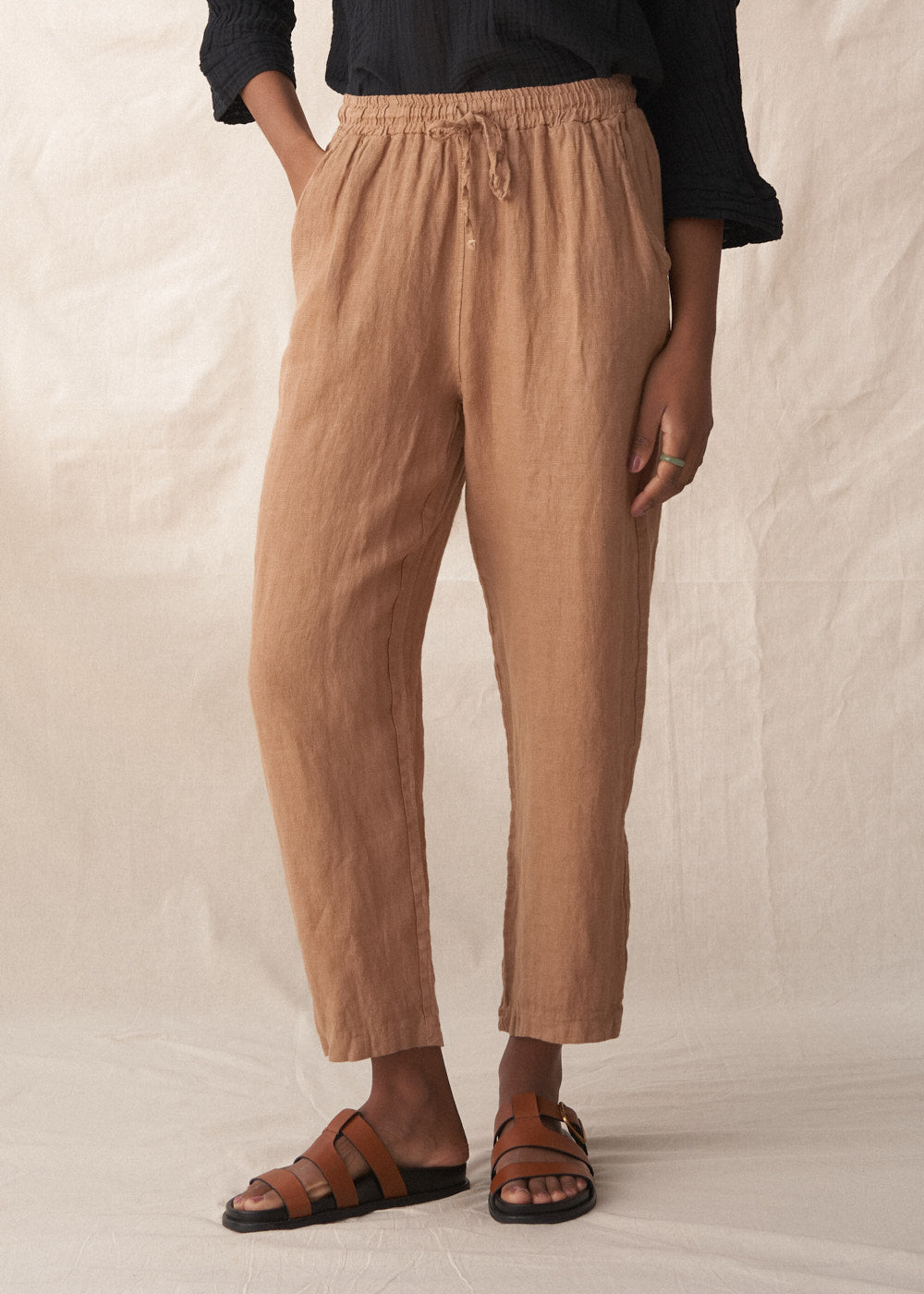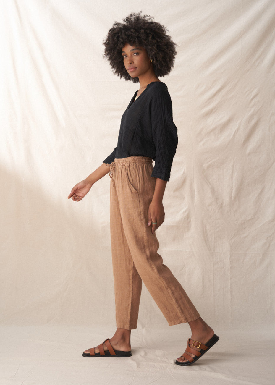 Simple and classic, the Linen trousers feature a tapered leg that gives a neat silhouette while being light and airy enough for the warmest weather. Finished in soft camel tones, these bottoms are a fuss-free summer staple. Pair with the matching Rudy jacket for a simple summer suit.