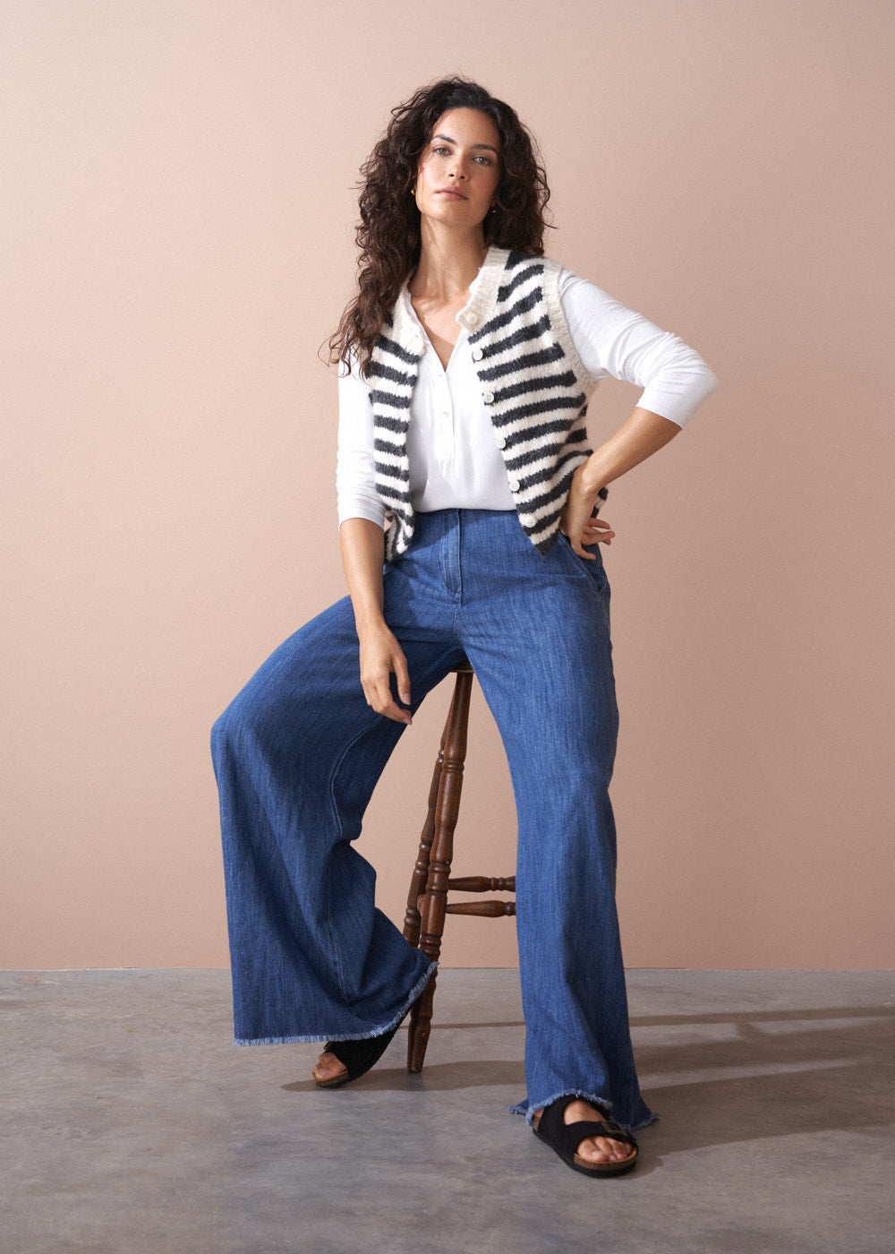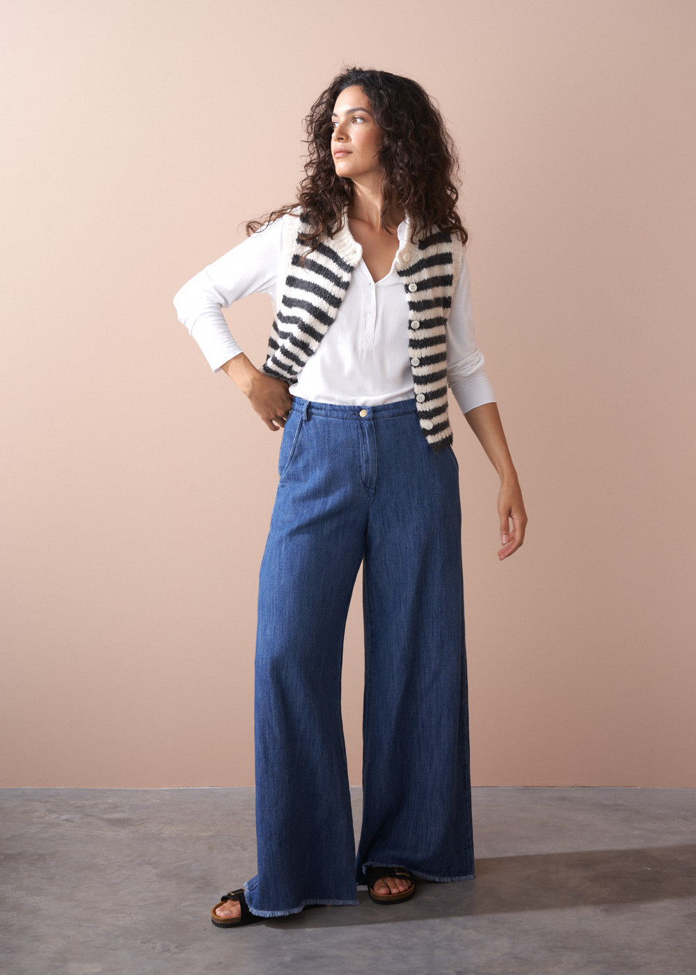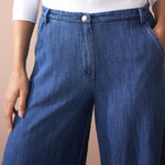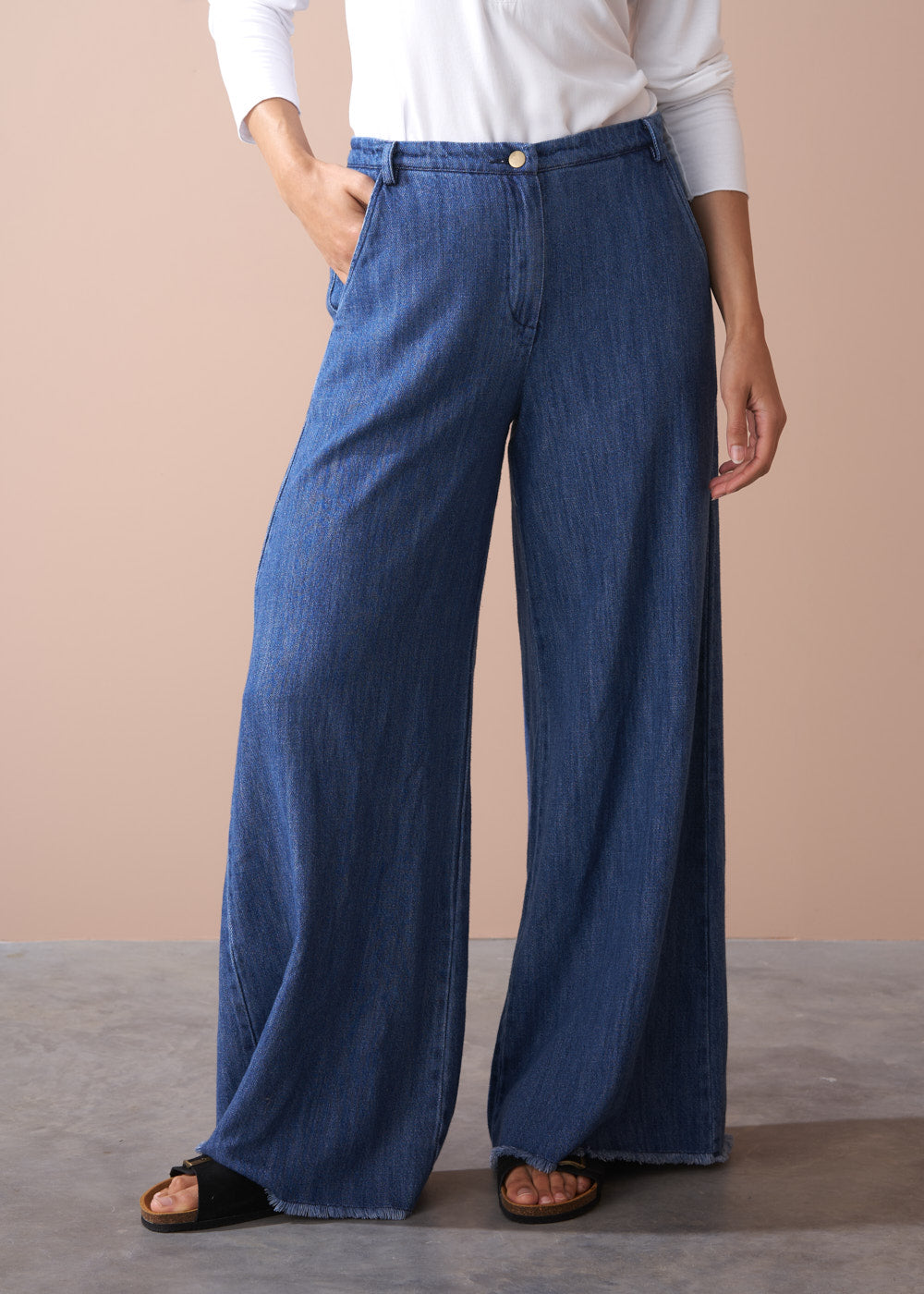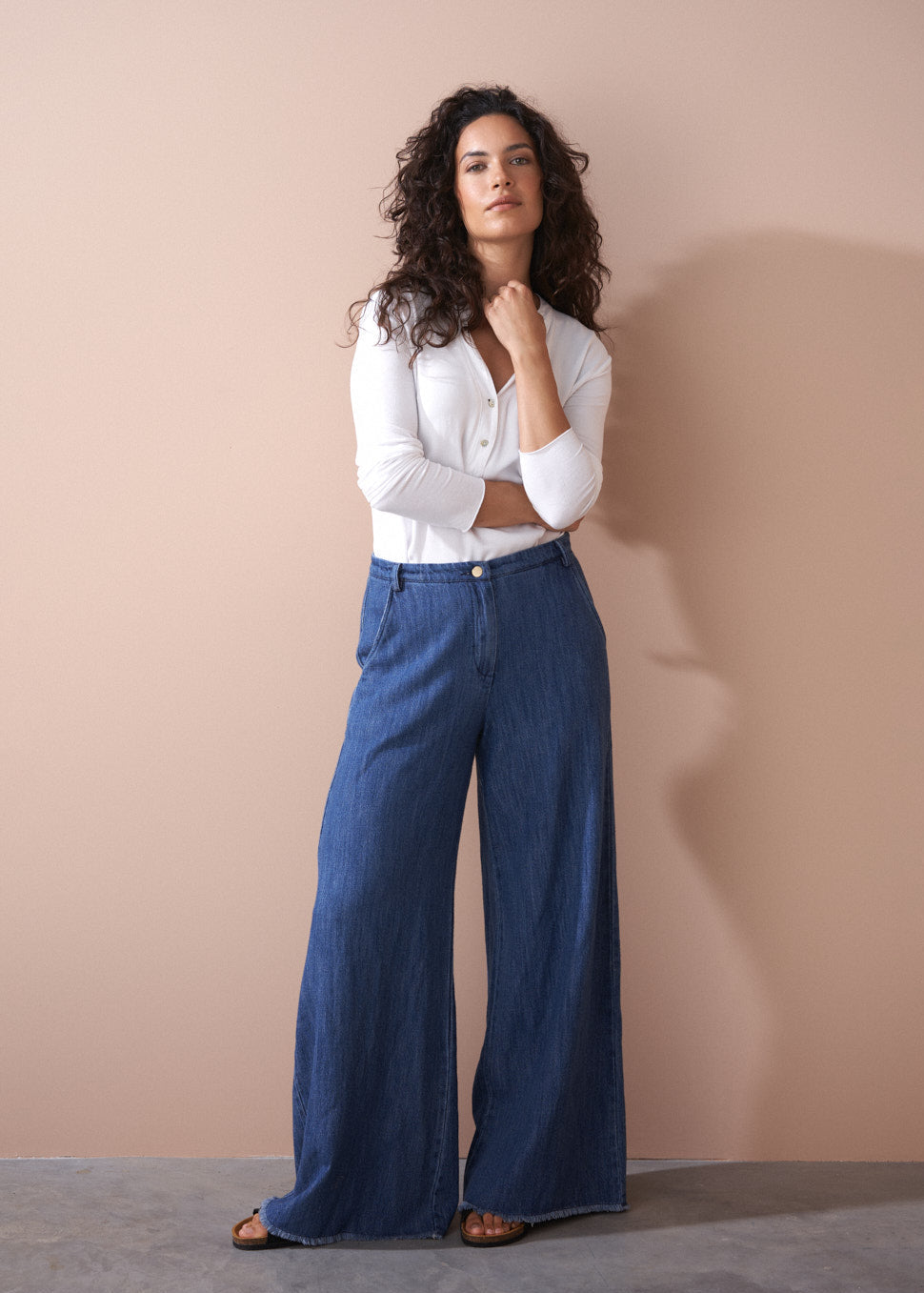 Wide-leg and full-length in a classic denim blue, the Casual Trousers are a staple in your wardrobe. Expertly crafted from ultra-soft cotton with a comfortable elasticated back waistband, these trousers merge the relaxed ease of cotton with the enduring style of timeless denim, finishing with a striking silhouette.