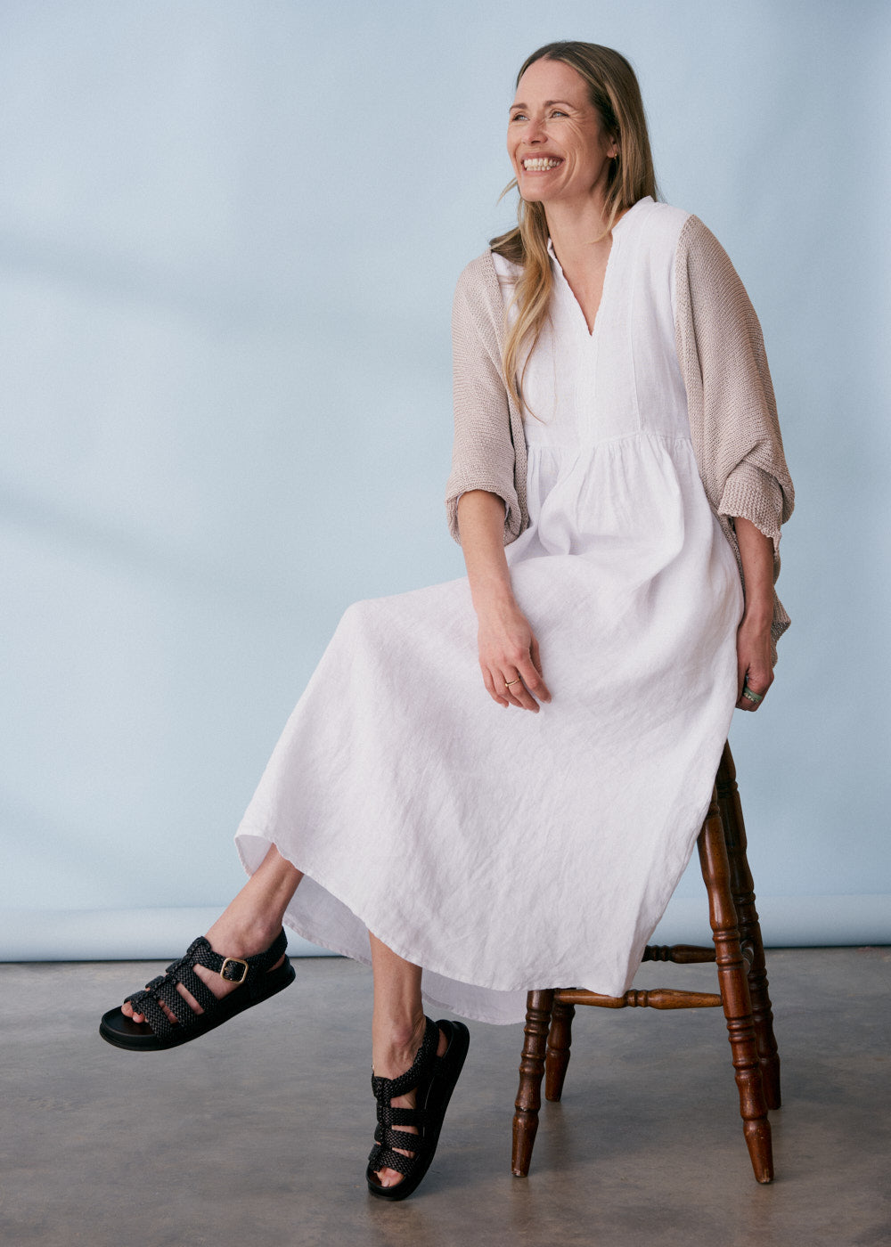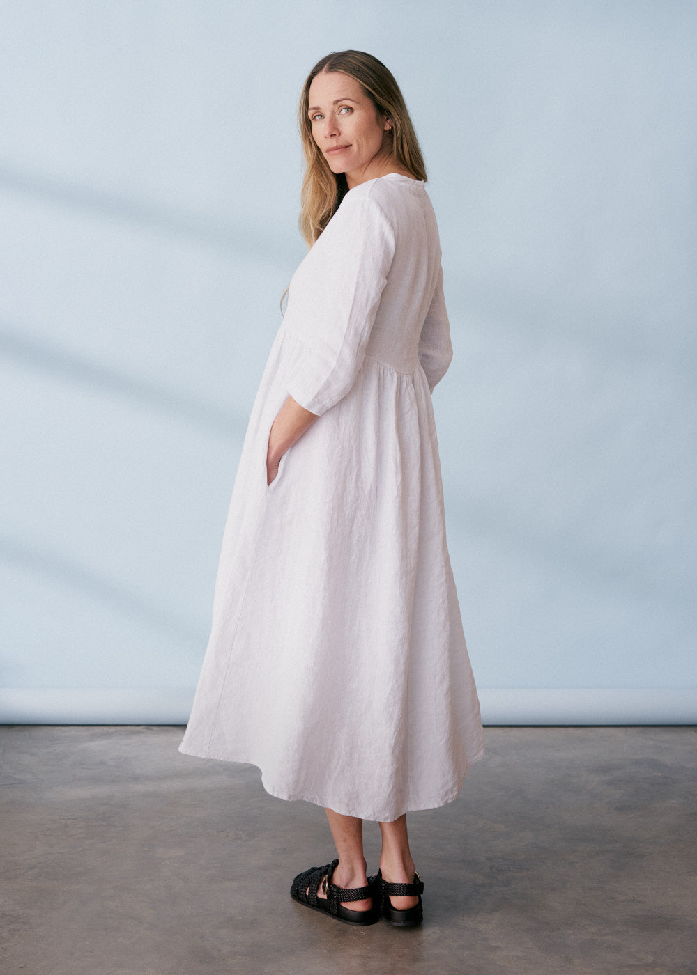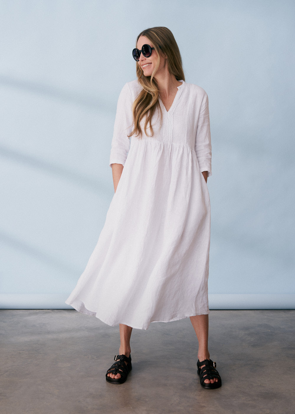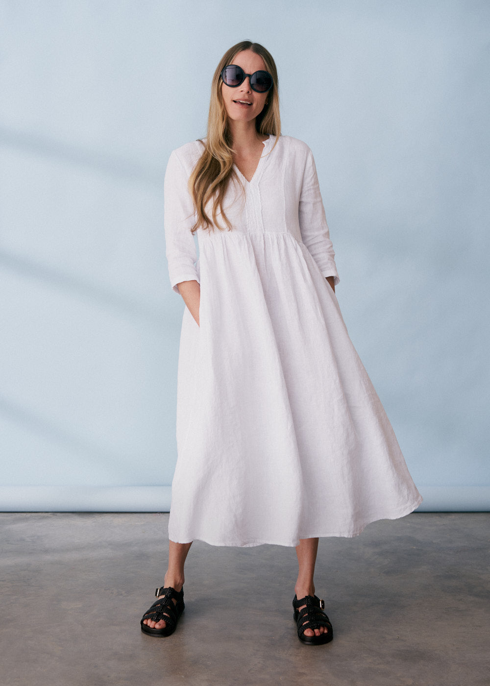 Featuring an empire-line silhouette and a flowing midi-maxi length, the dress effortlessly blends the airy elegance of linen with thoughtful design details, perfect for the transition into warmer days.
