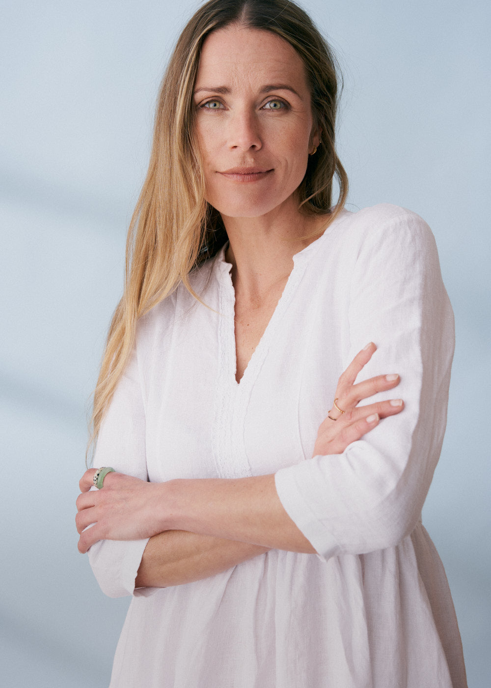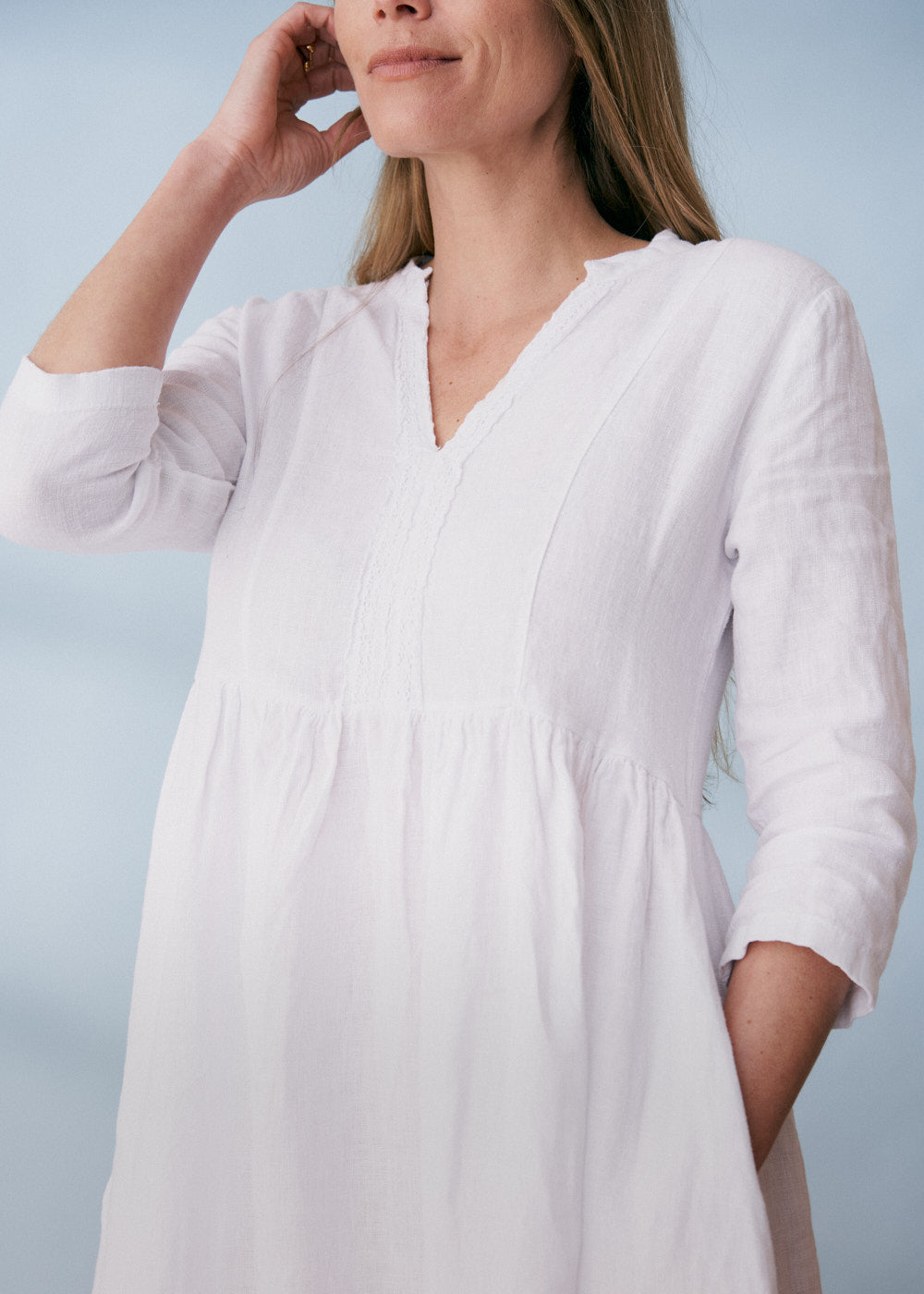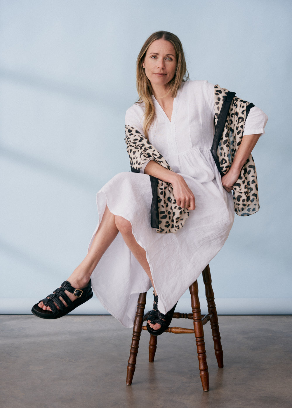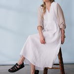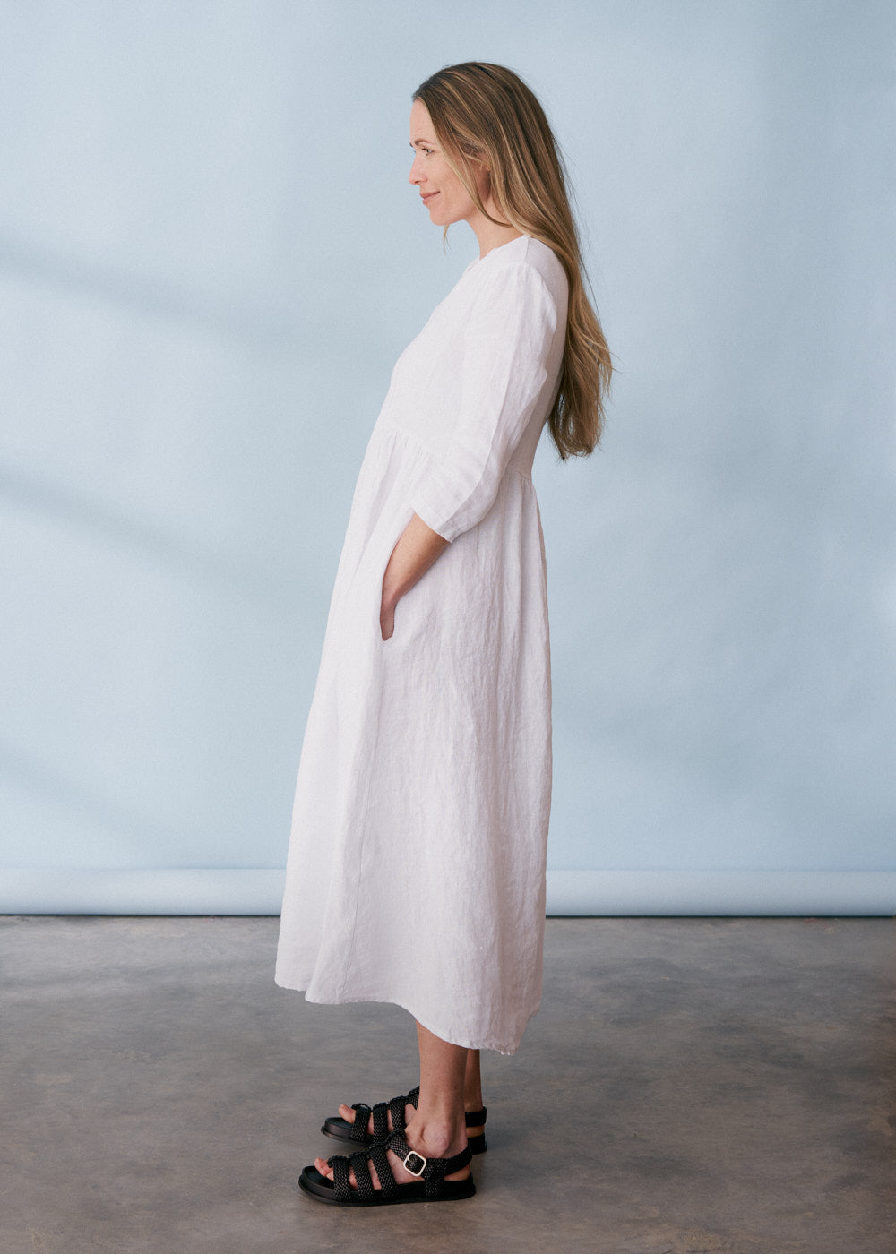 Featuring an empire-line silhouette and a flowing midi-maxi length, the dress effortlessly blends the airy elegance of linen with thoughtful design details, perfect for the transition into warmer days.