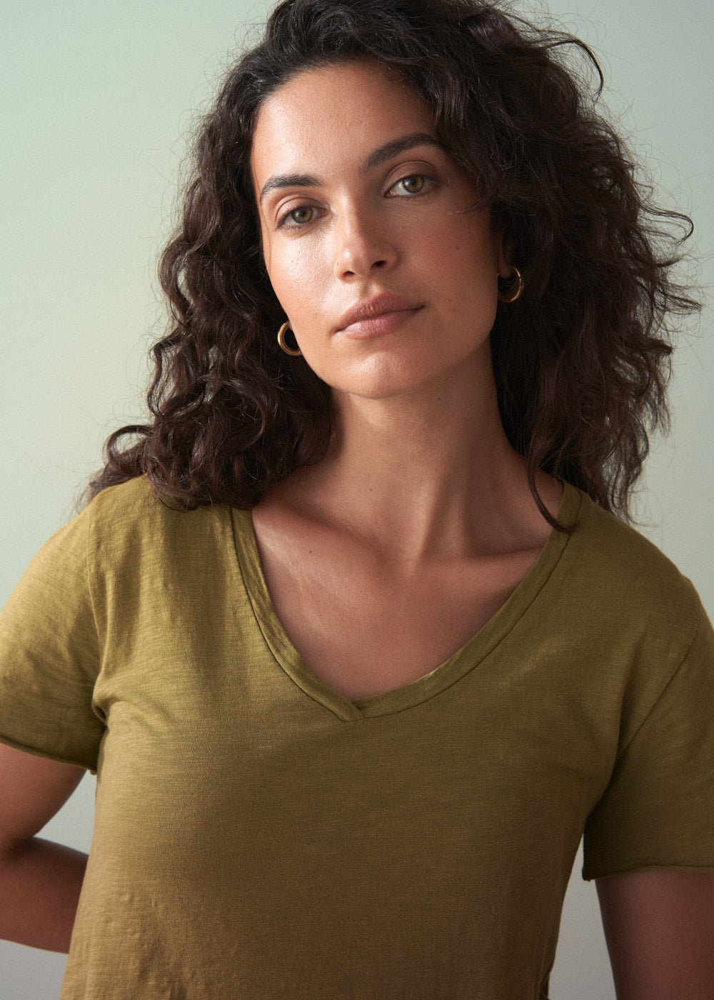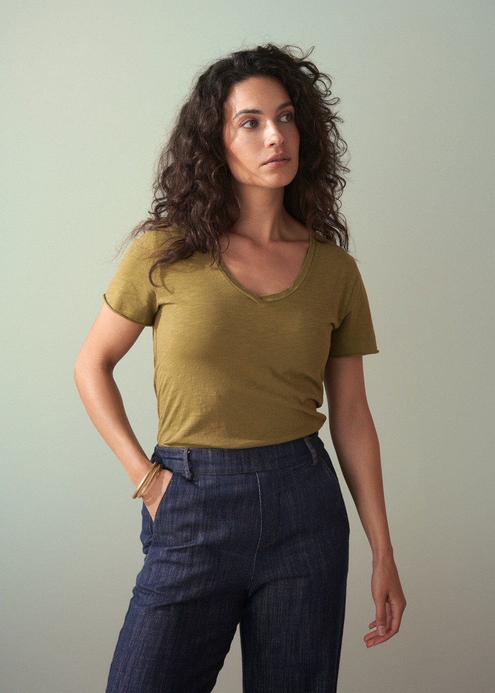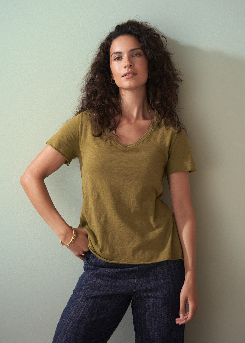 Soft, practical and effortlessly versatile, the T shirt in olive is perfect for adding a punchy pop of colour to your cross-seasonal wardrobe. The v-neck adds to the classic style while raw edges on the sleeves and hem lend a modern, undone finish.