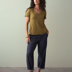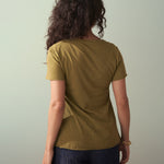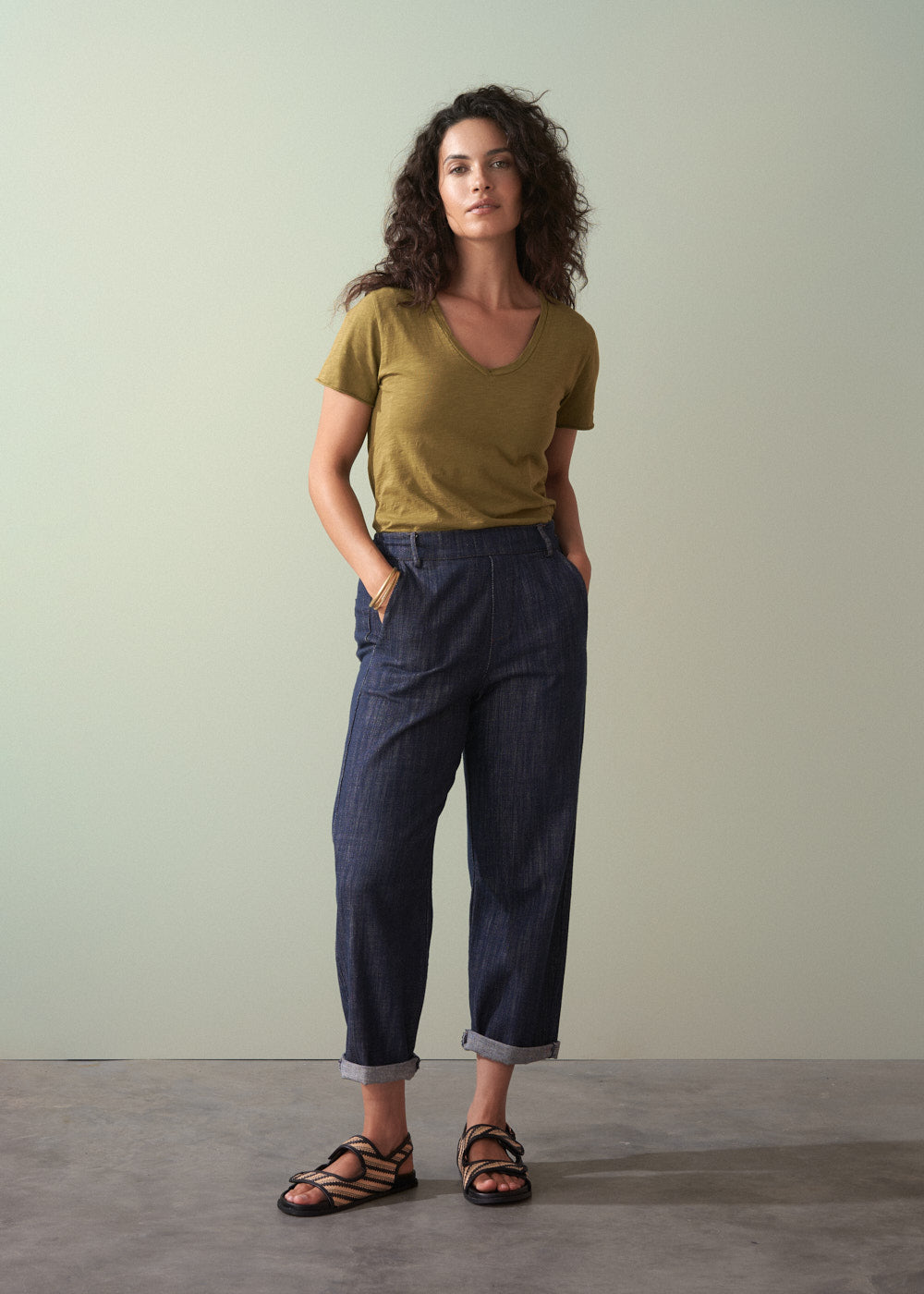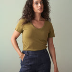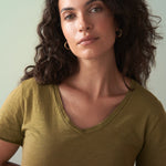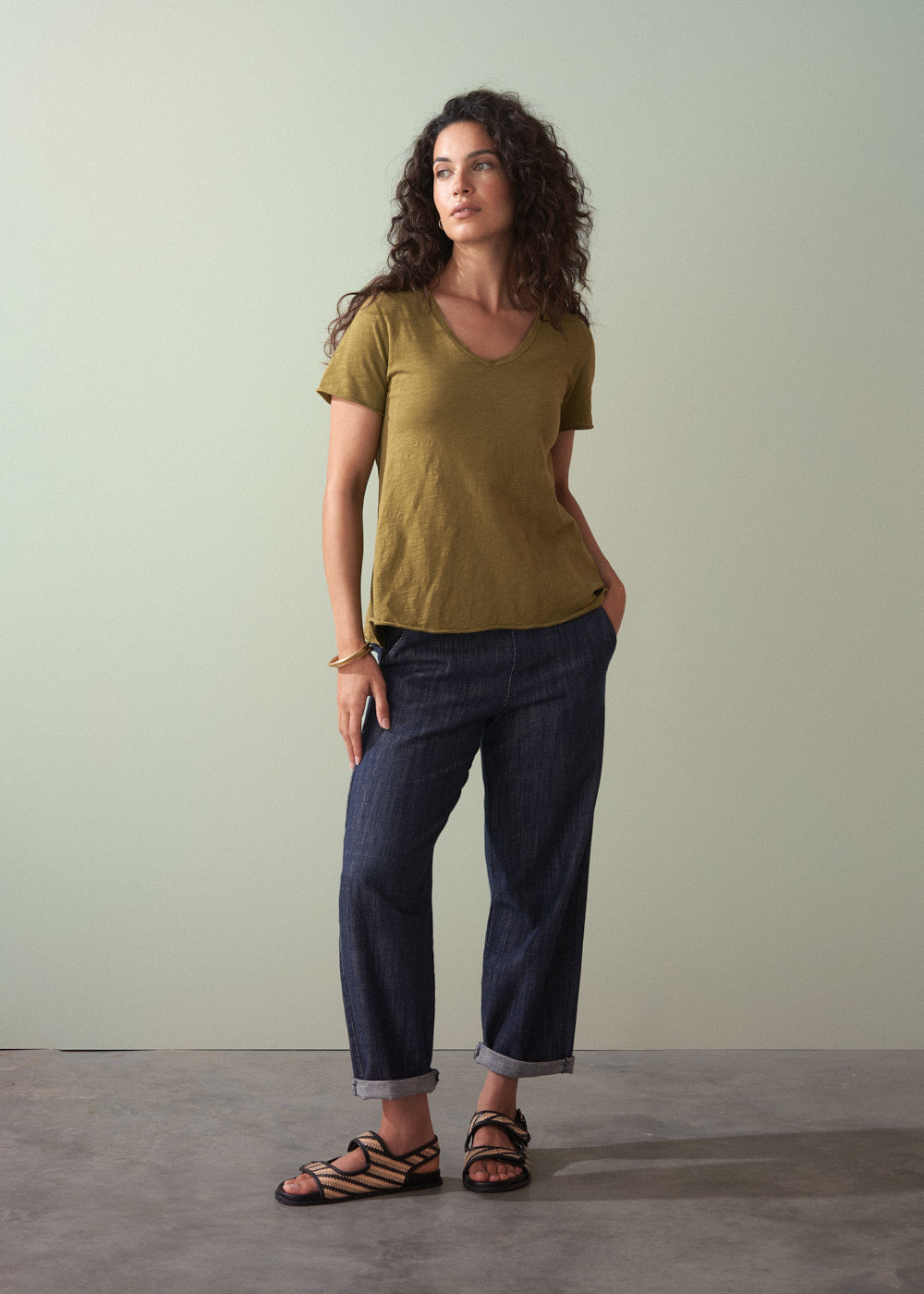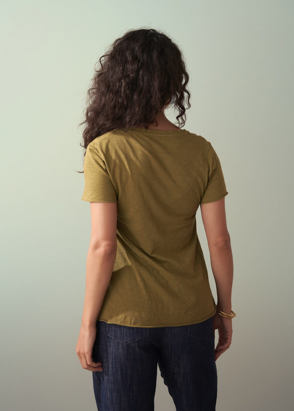 Soft, practical and effortlessly versatile, the T shirt in olive is perfect for adding a punchy pop of colour to your cross-seasonal wardrobe. The v-neck adds to the classic style while raw edges on the sleeves and hem lend a modern, undone finish.