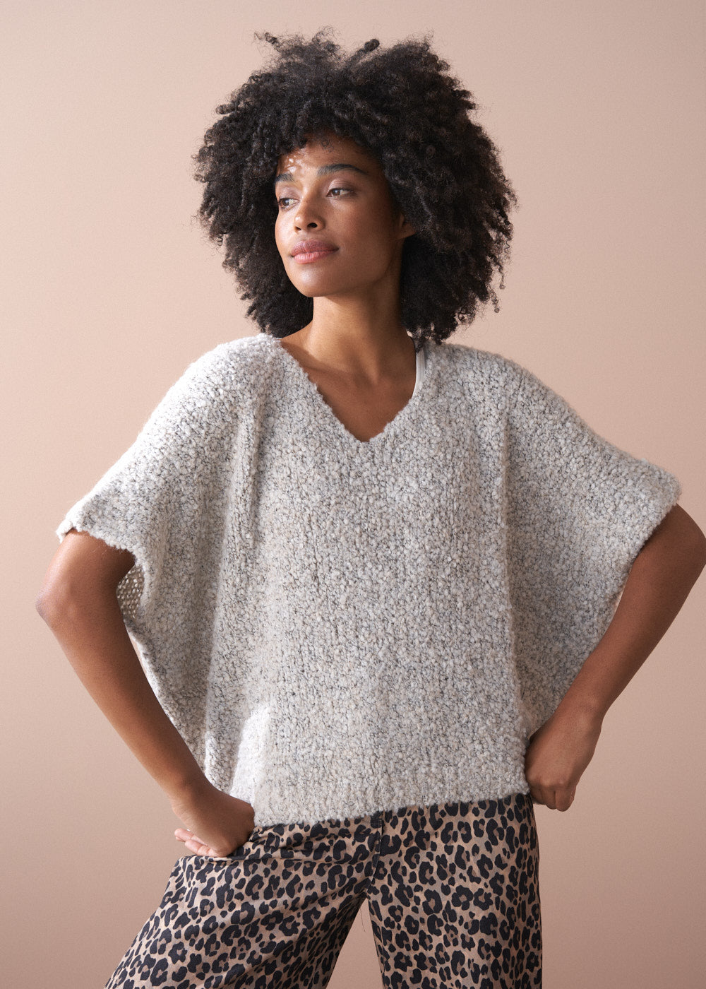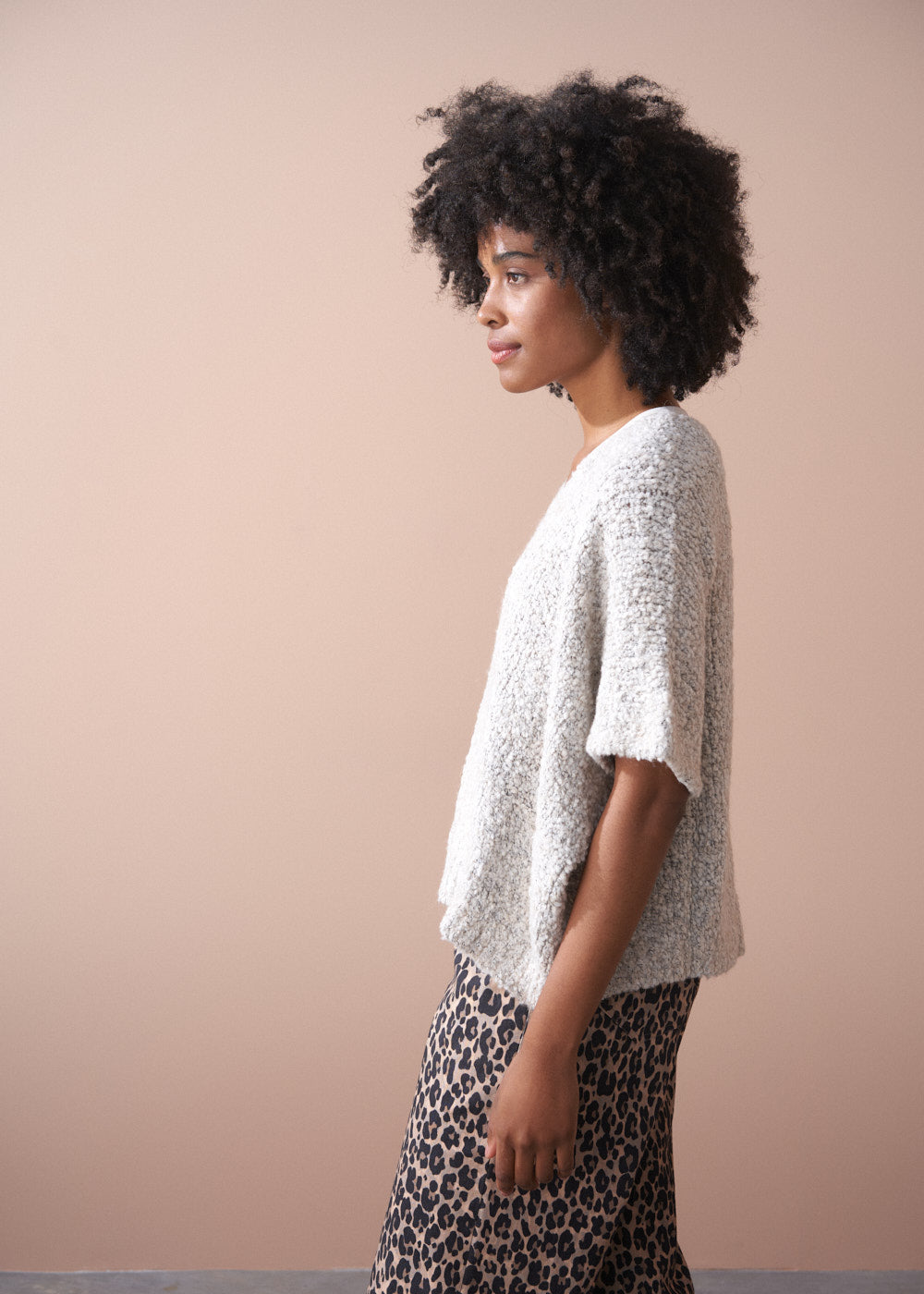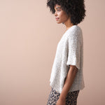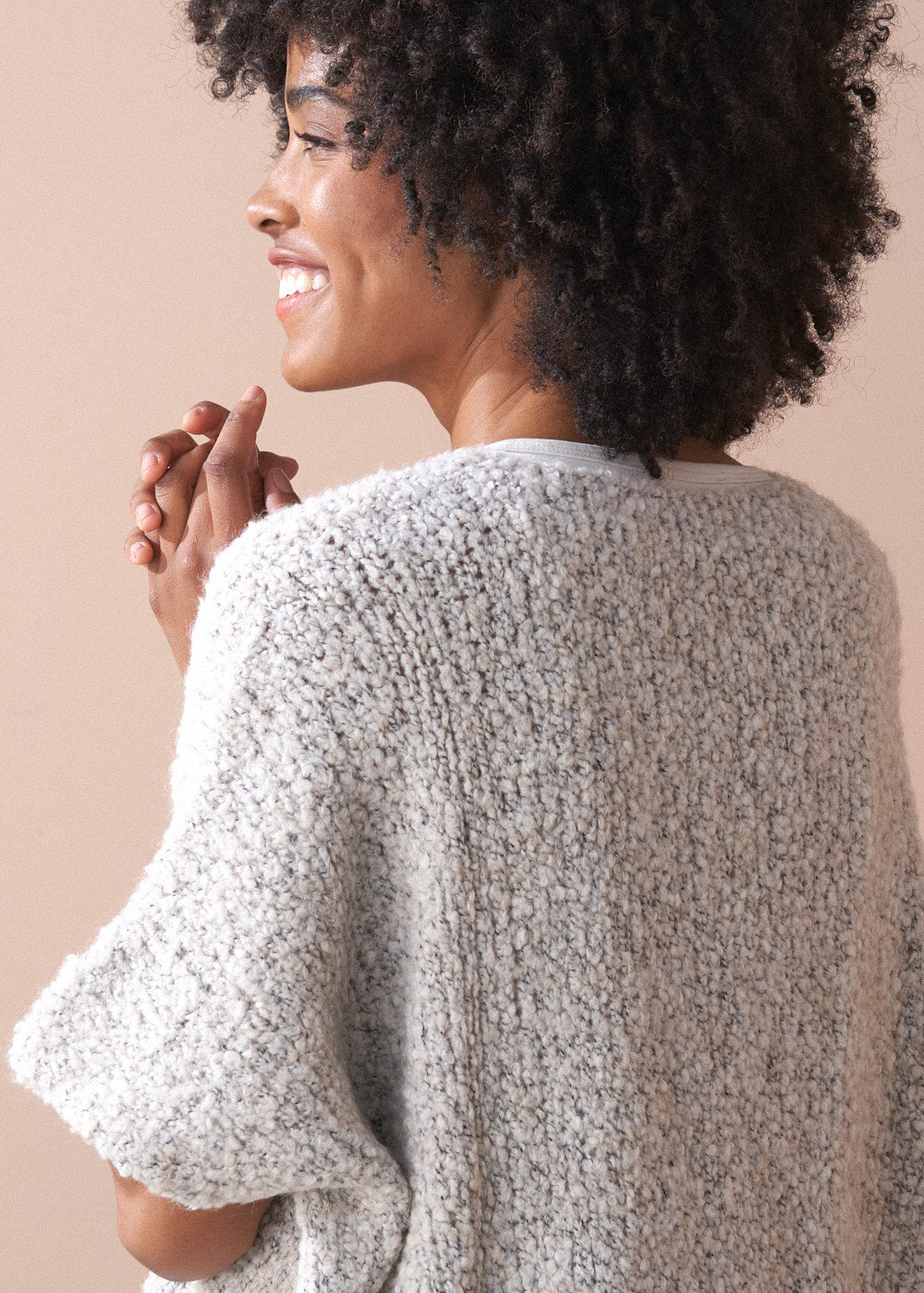 Crafted from a luxurious alpaca wool blend, the sweater showcases a rich bouclé texture and an oversized, boxy silhouette, making it the perfect statement layering piece.