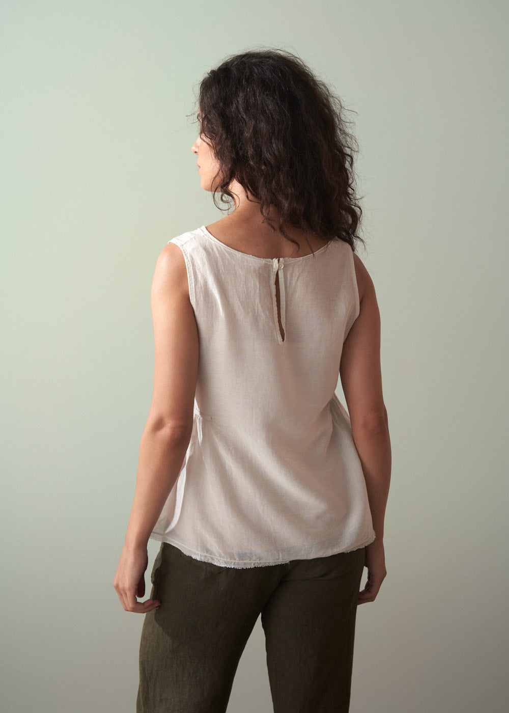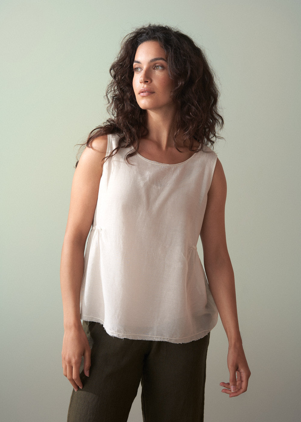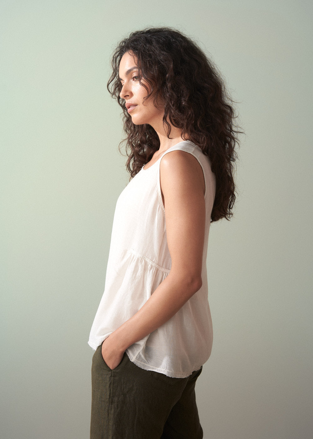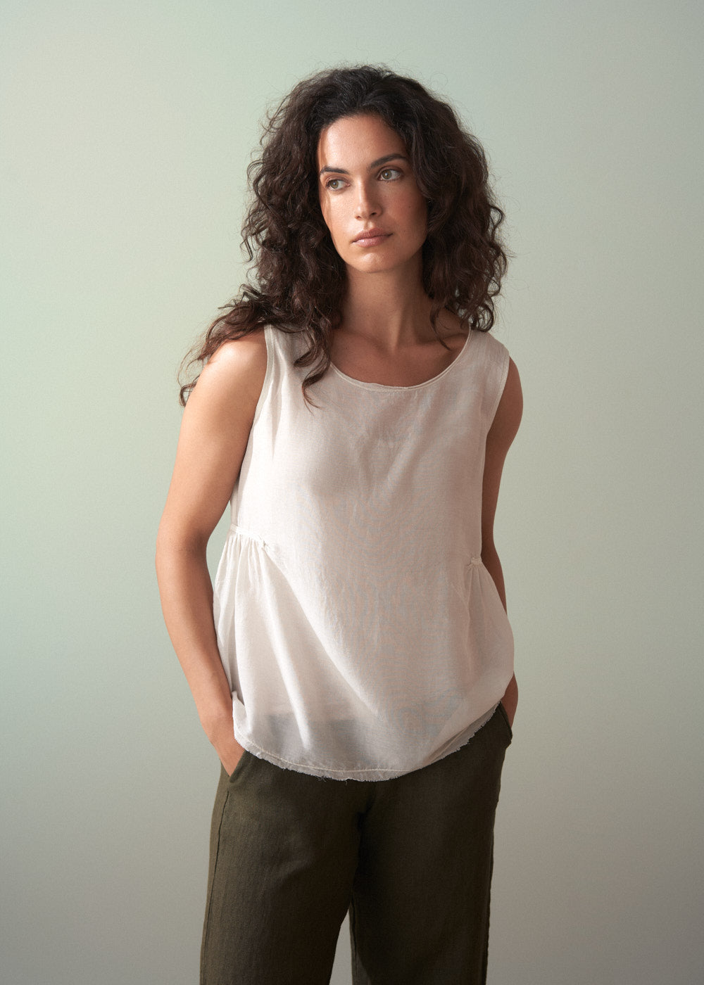 The Silk Mix Top has a beautifully sheer finish and a unique gathering feature on the waist, creating a subtle peplum silhouette. Crafted from a luxurious silk and cotton blend in a delicate off-white hue, it’s light, airy and perfect for warm days.