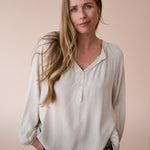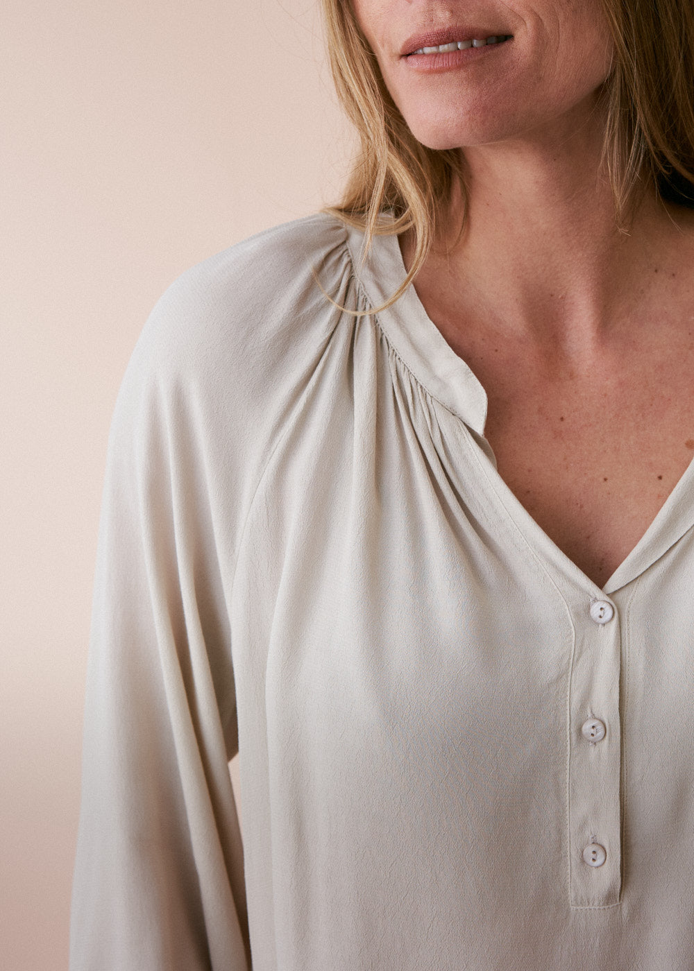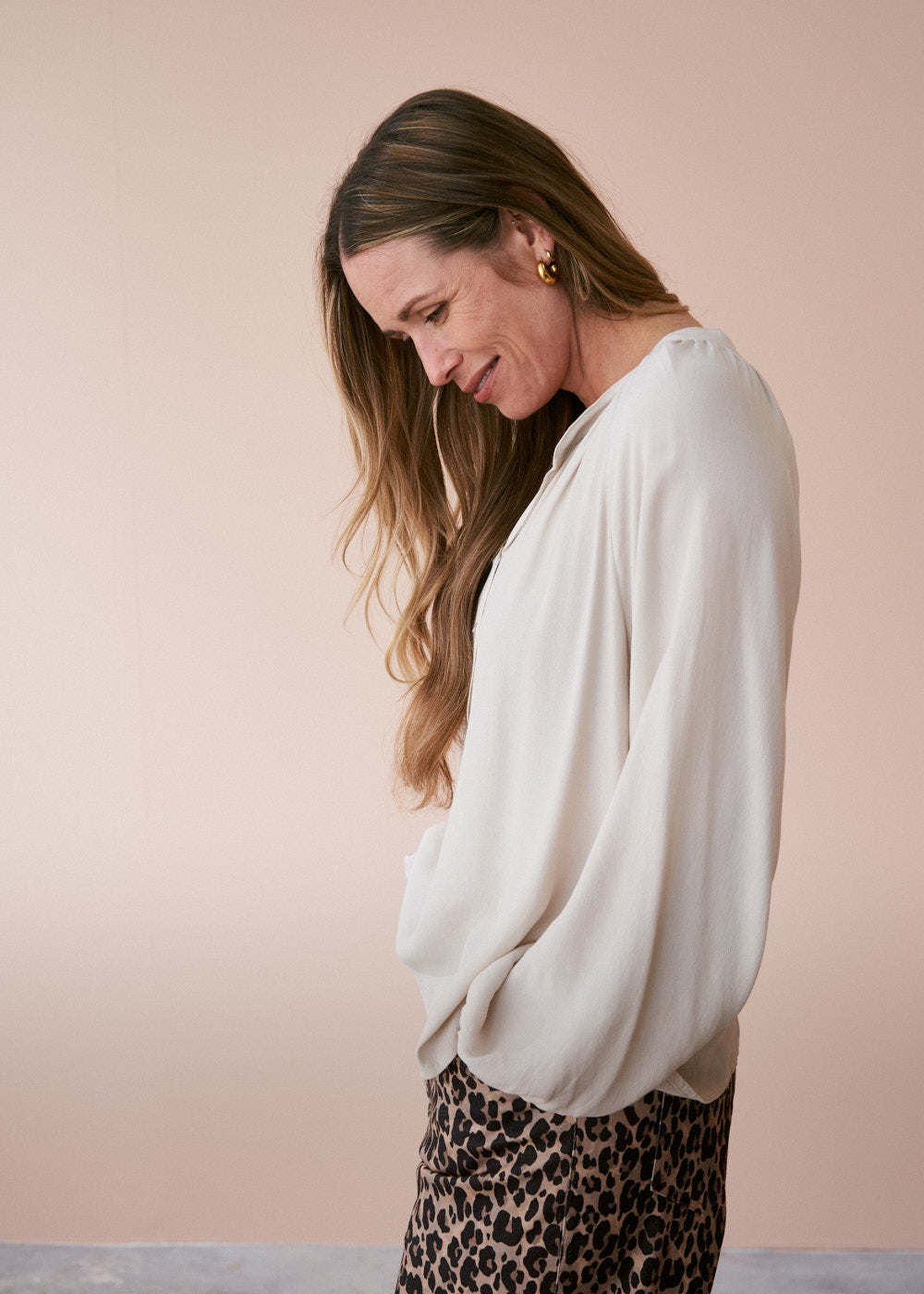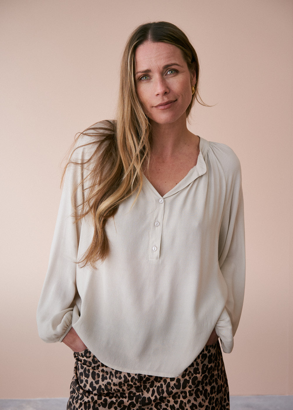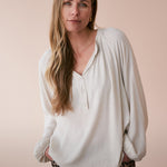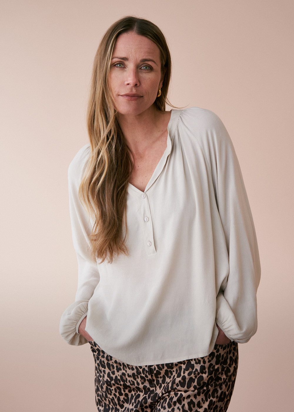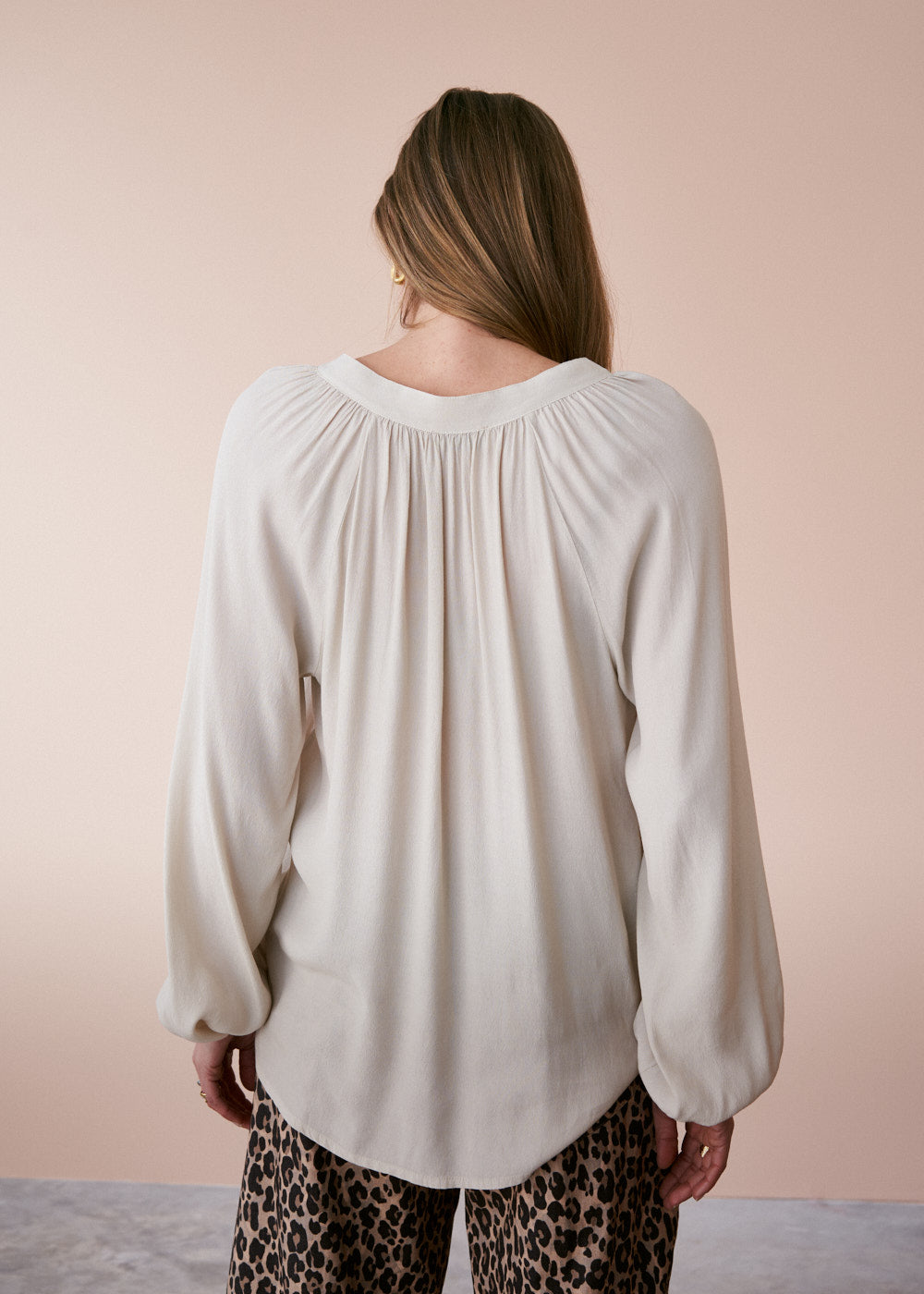 The bestselling Top returns in its versatile oatmeal hue. Designed with a soft crepe finish, voluminous sleeves and subtle pleat detailing, the Betsy brings ease and polish in equal measure, perfect for dressing up or down.