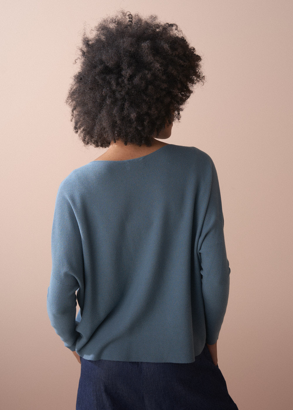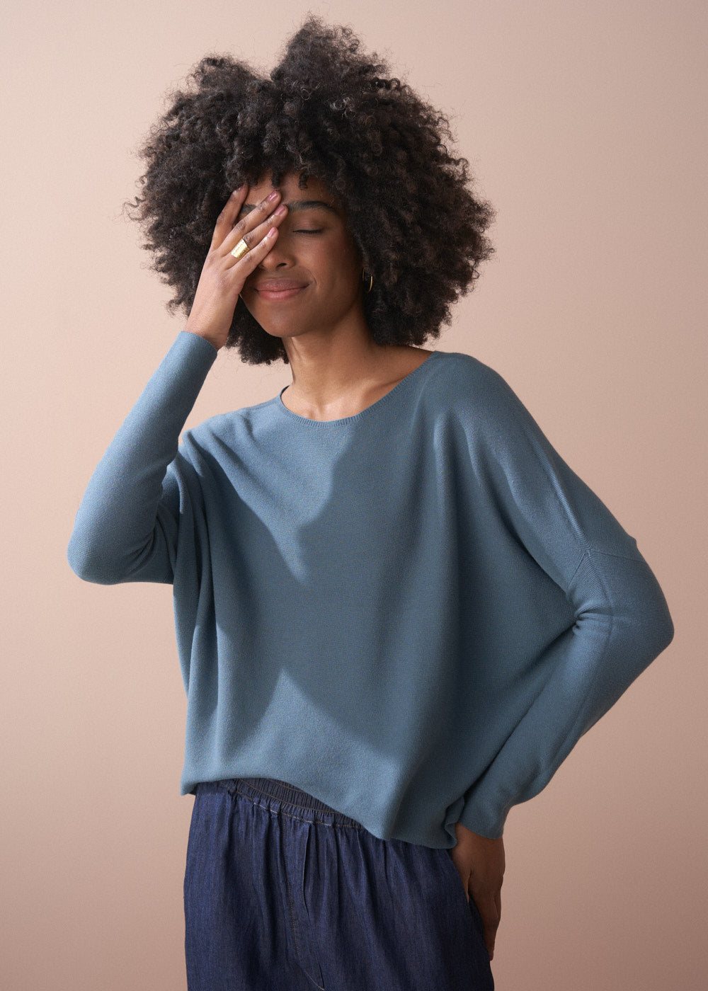 - The dropped shoulders and relaxed body allow the fabric to skim the lower torso