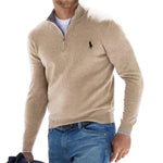 This men's sweater is made from wool and features a logo print. The model has a stand-up collar and long sleeves. The sweater has a zipper fastening.