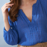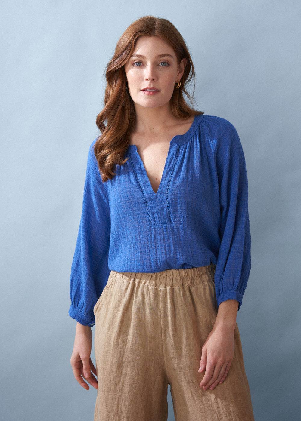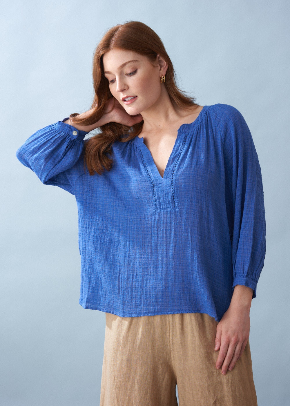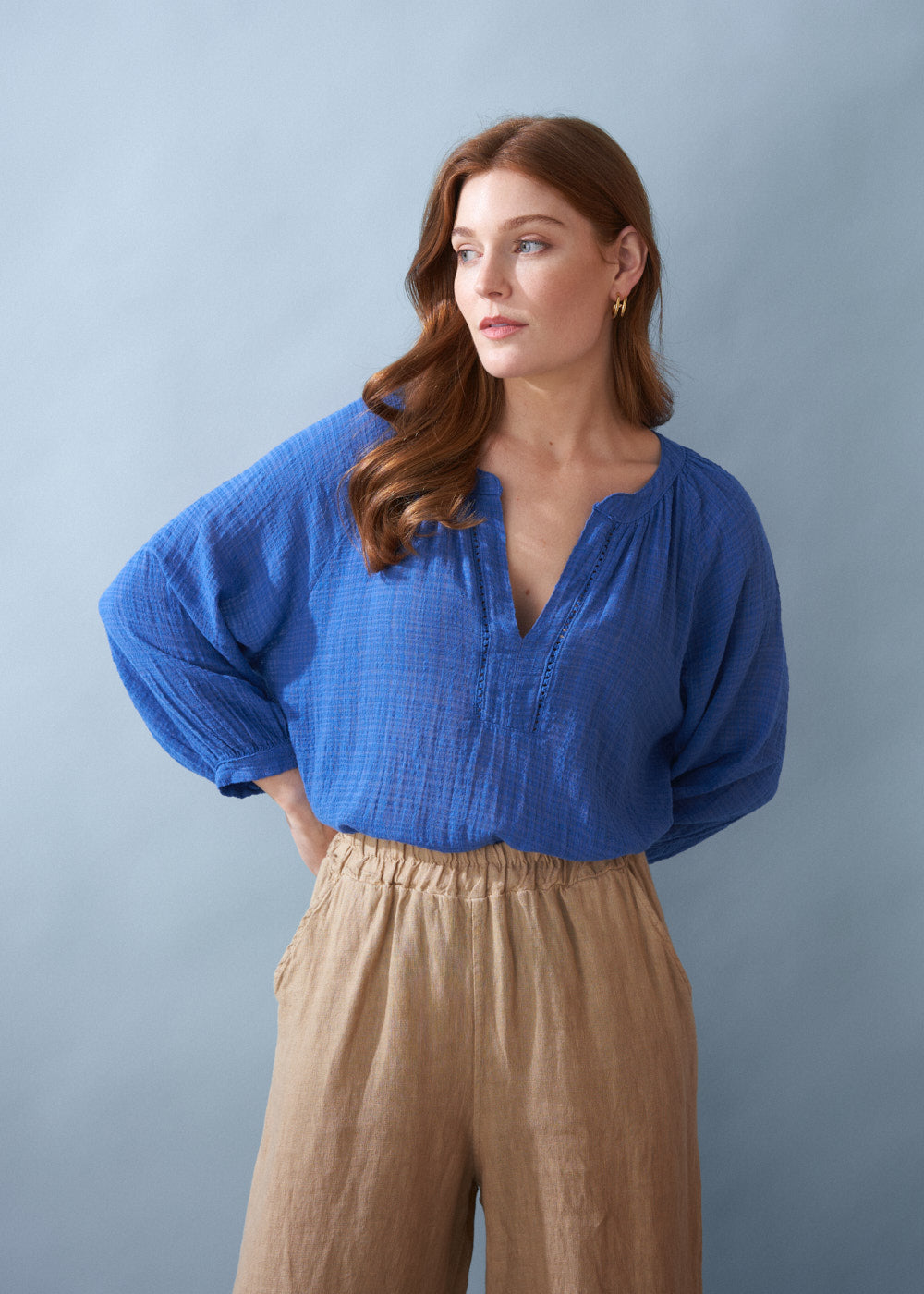 Made from soft, lightweight cotton, the Casual Cotton Top is a breathable and airy blouse with a relaxed, laid-back feel. It features a simple A-line silhouette and 3/4 length raglan sleeves.
